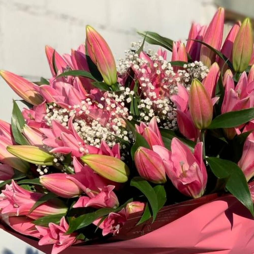 Лилия розовая – 9 шт.Гипсофила – 3 шт.Упаковка дизайнерская – 1 шт.