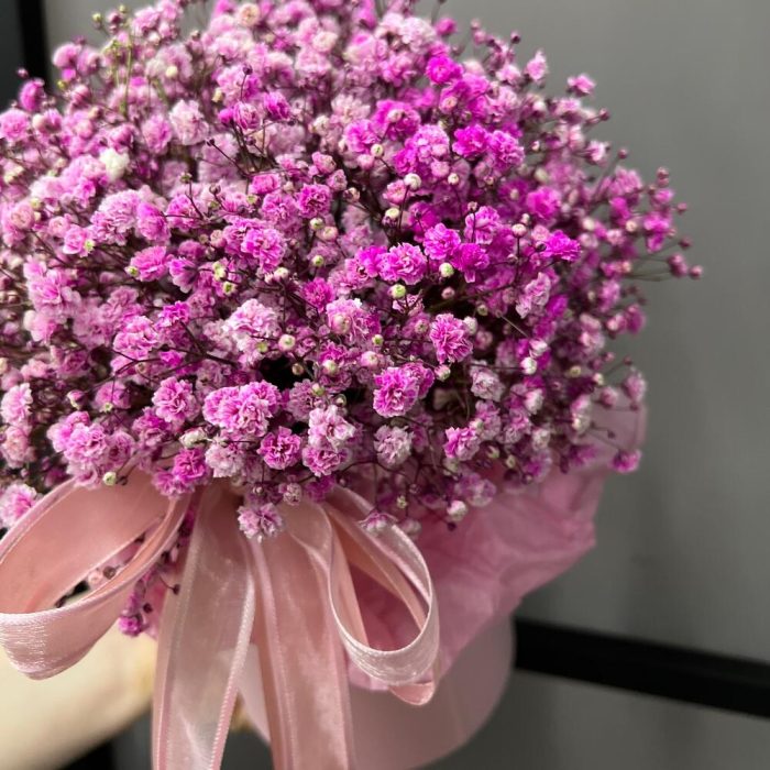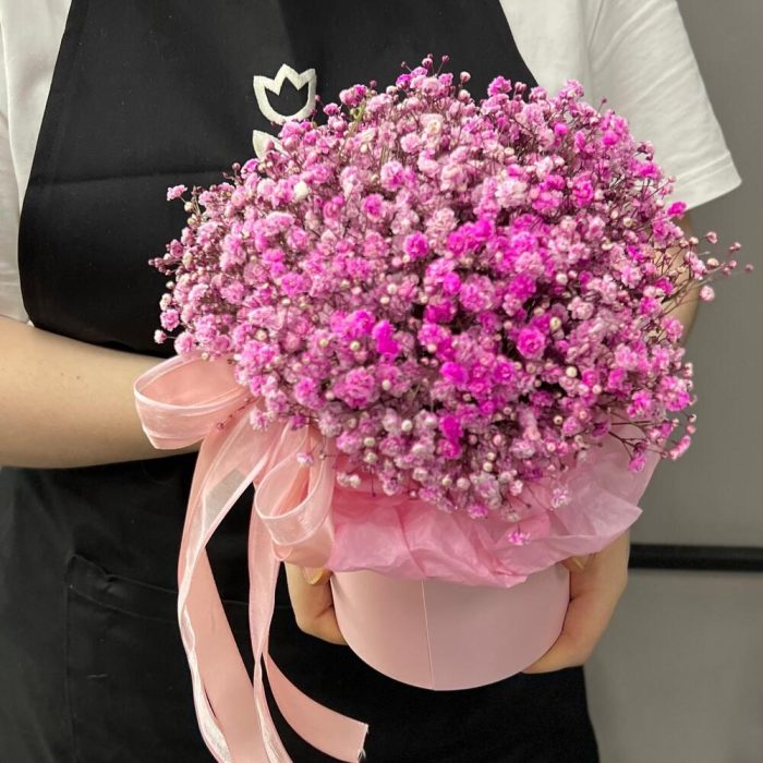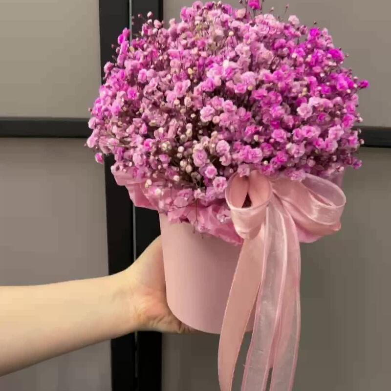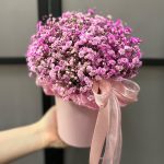 “Сиреневый туман” – композиция из гипсофилы в шляпной коробке