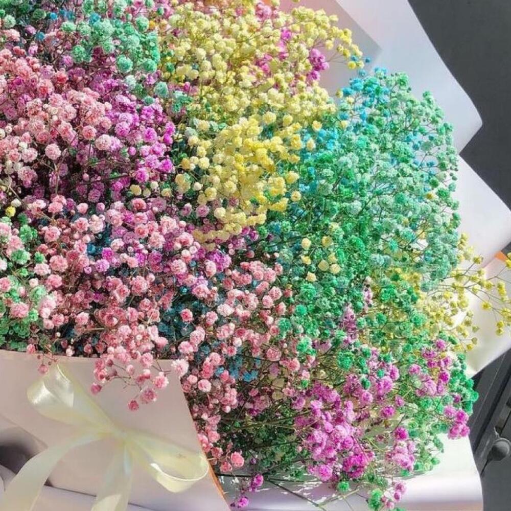 гипсофила радужная – 51 шт.Упаковка дизайнерская – 1 шт.Лента атласная – 2 шт.Открыточка с вашими пожеланиями – 1 шт.хорошее настроение – 100 шт.инструкция по уходу за цветами – 1 шт.коробка переноска – 1 шт.Кризал – 1 шт.