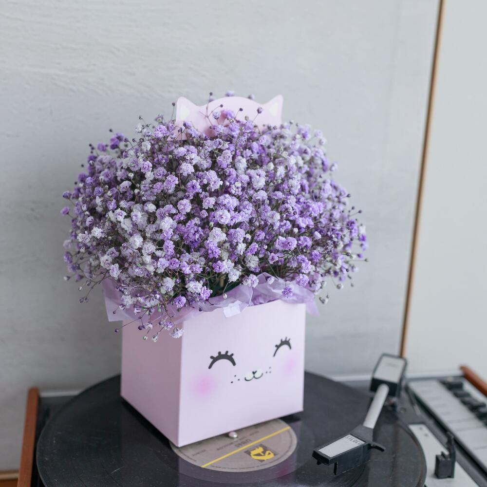 Тишью – 4 шт.Оазис флористический – 1 шт.коробка транспортировочная – 1 шт.коробка котик – 1 шт.гипсофила цветная – 5 шт.