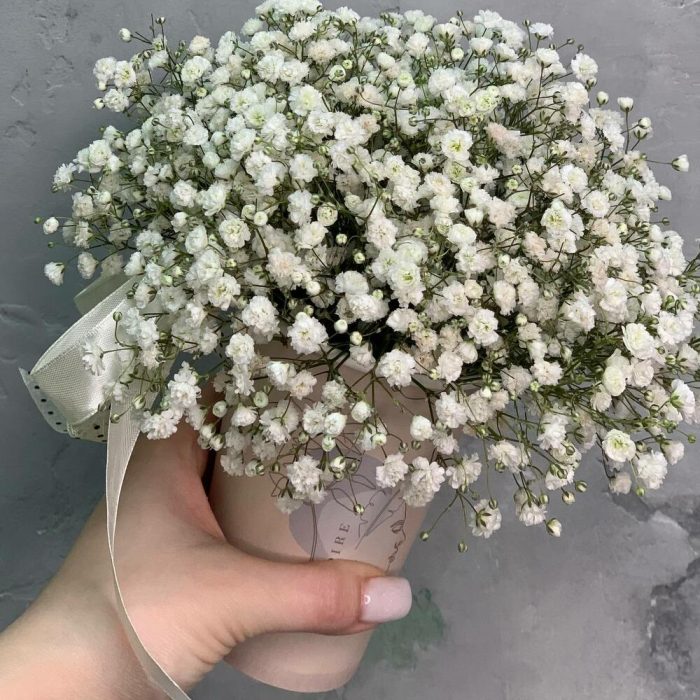 “Сиреневый туман” – композиция из гипсофилы в шляпной коробке