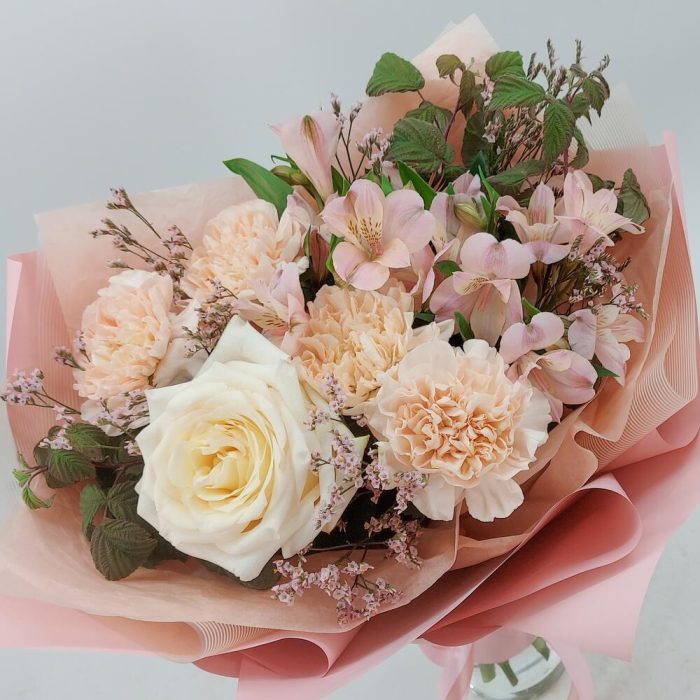 Лимониум – 2 шт.Зелень – 4 шт.Упаковка дизайнерская – 1 шт.альстромерия премиум – 2 шт.гвоздика сортовая (диантус) – 4 шт.роза пионовидная кэндллайт – 1 шт.