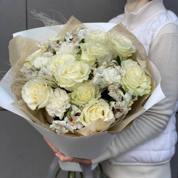 роза одноголовая mondial – 11 шт.Альстромерия – 5 шт.Диантус – 5 шт.Подарочная упаковка – 1 шт.средство для продления жизни срезанных цветов – 1 шт.