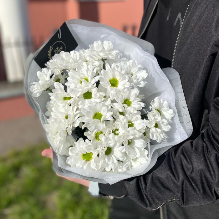 Тишью – 1 шт. Атласная лента – 1 шт. Ромашковая хризантема – 5 шт. Дизайнерская упаковка – 1 шт.
