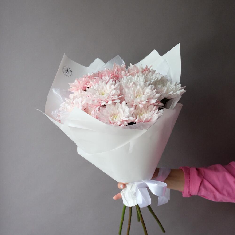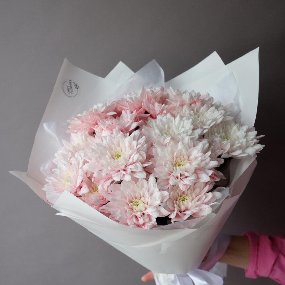 Хризантема кустовая – 5 шт.Тишью – 1 шт.Упаковка дизайнерская – 1 шт.Открыточка с вашими пожеланиями – 1 шт.