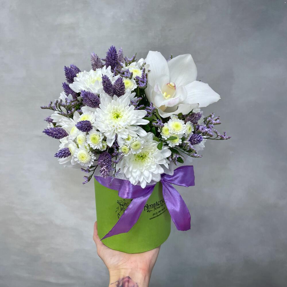 Коробка d12 – 1 шт.Оазис – 1 шт.Хризантема кустовая – 3 шт.Хризантема сталион – 2 шт.Лимониум – 2 шт.Фаларис – 9 шт.орхидея – 1 шт.Фисташка – 2 шт.