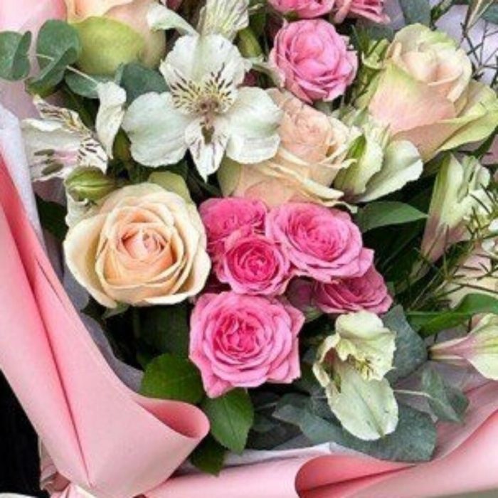 Букет роз , альстромерий и эвкалипта в дизайнерской упаковке