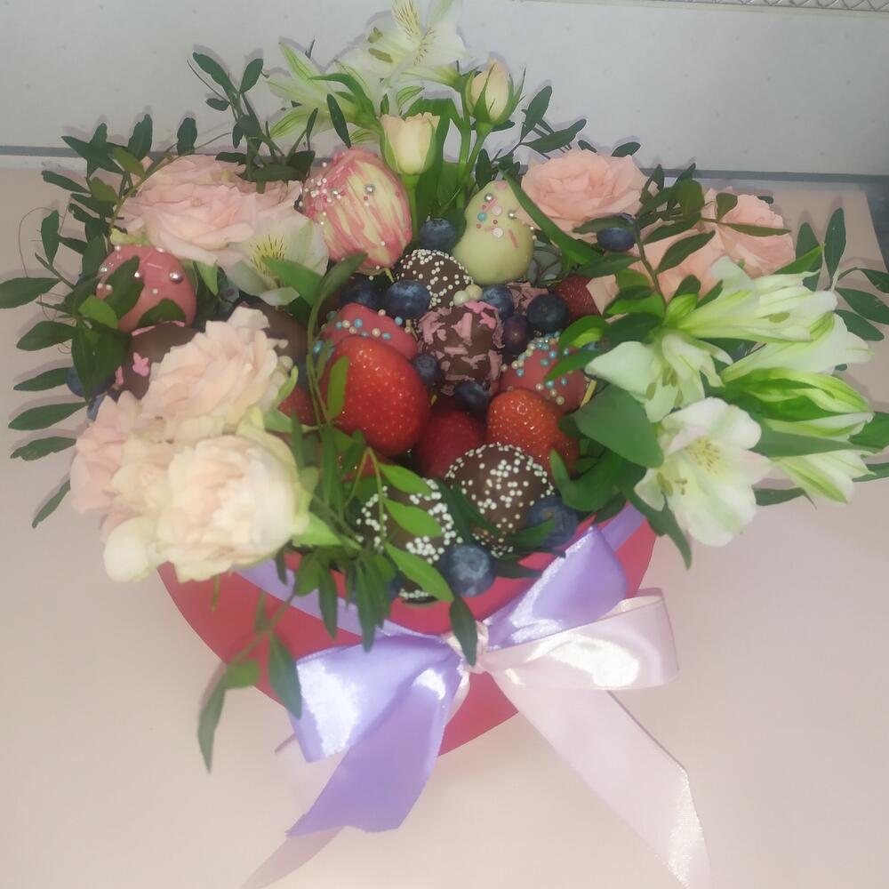 Альстромерия – 2 шт.Клубника – 25 шт.Роза кустовая розовая – 3 шт.Коробка сердце – 1 шт.Фисташка пучок – 1 шт.Клубника в шоколаде – 13 шт.