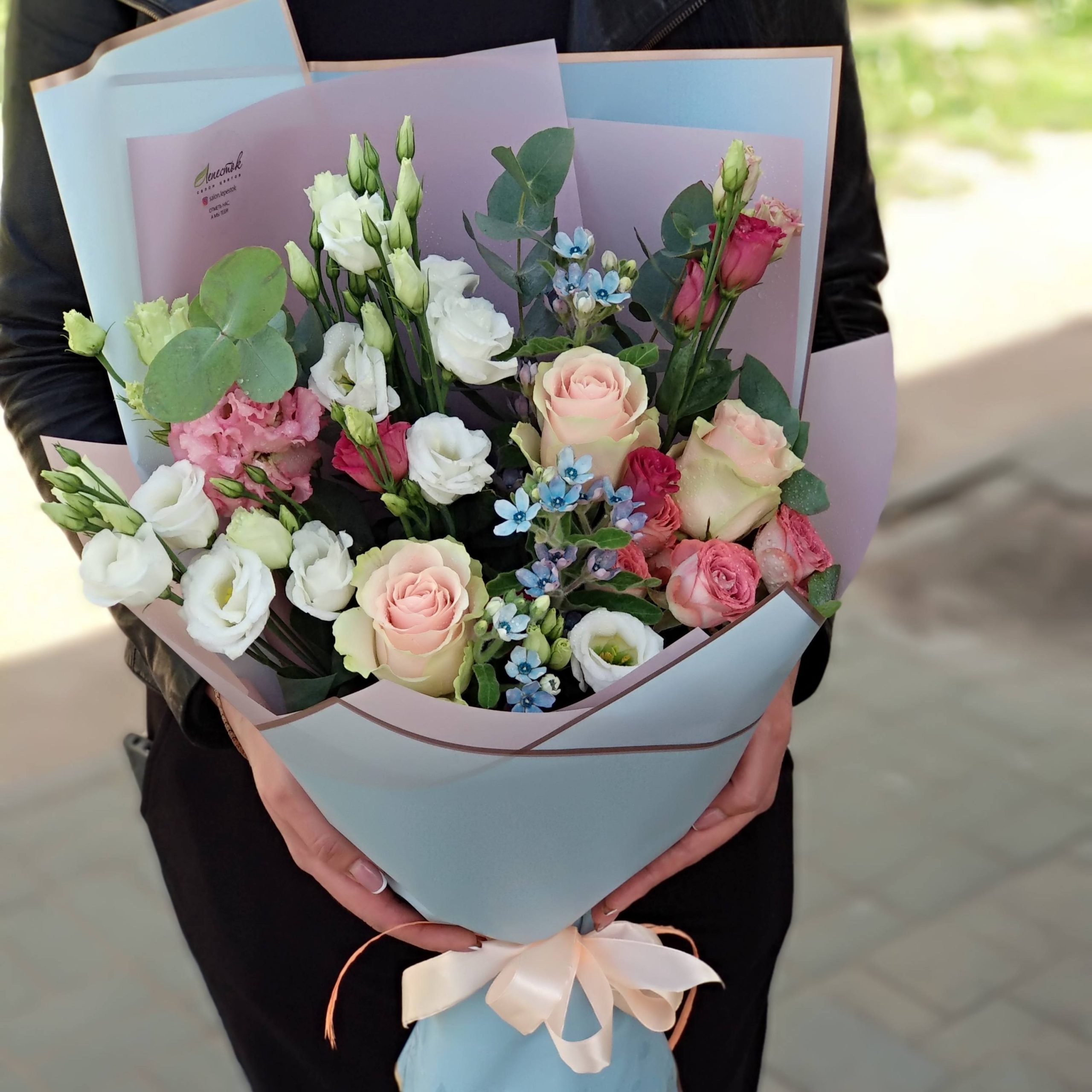 Альстромерии, Гвоздики, Кустовые розы, Лизиантусы, Розы, Хризантемы