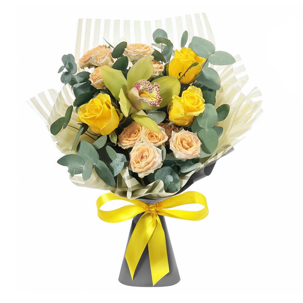 Эвкалипт – 1 шт.пленка цветная – 1 шт.лента атласная (желтый) – 1 шт.орхидея цимбидиум (зеленый) – 1 шт.