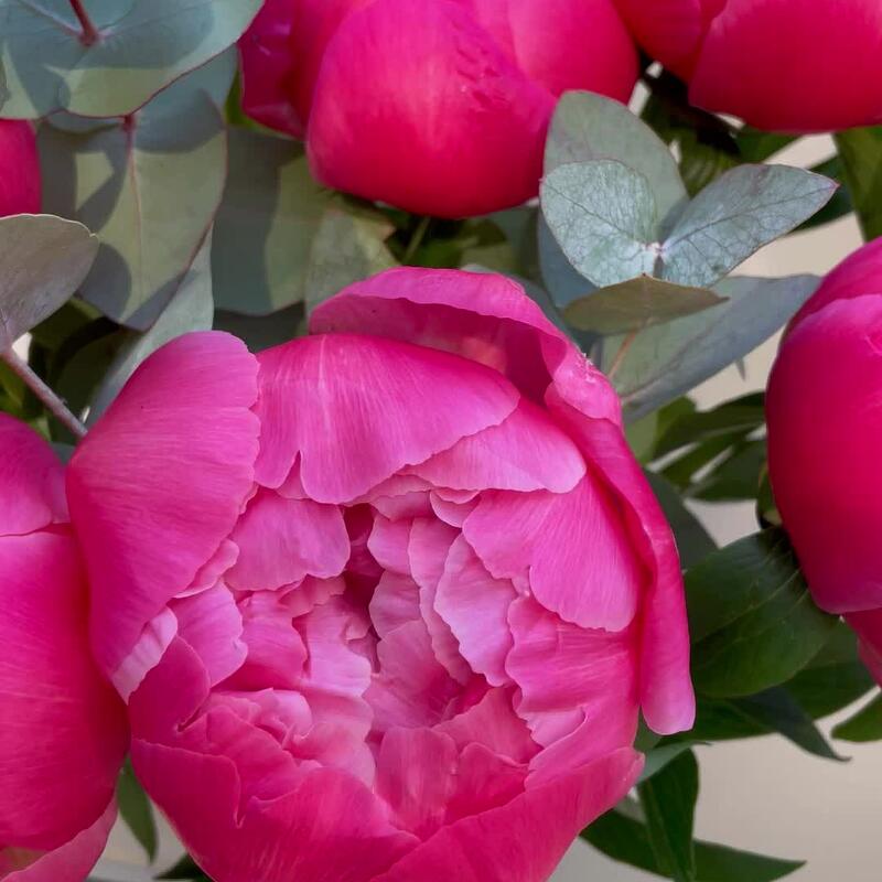 Пион Коралл Шарм (Coral Charm) – 9 шт.Эвкалипт – 4 шт.Лента атласная – 2 шт.Упаковка дизайнерская – 4 шт.