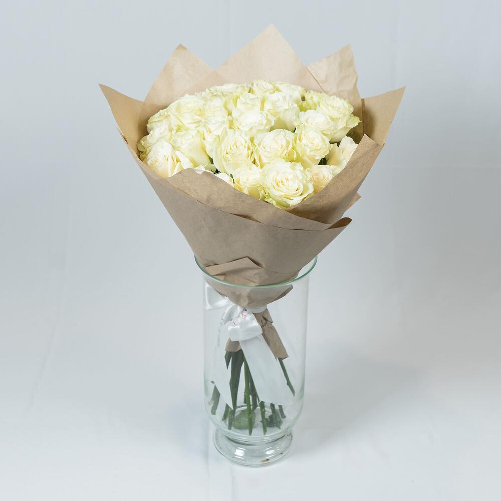 Роза мондиаль 60 см – 25 шт.Крафт дизайнерский – 1 шт.Лента атласная – 1 шт.