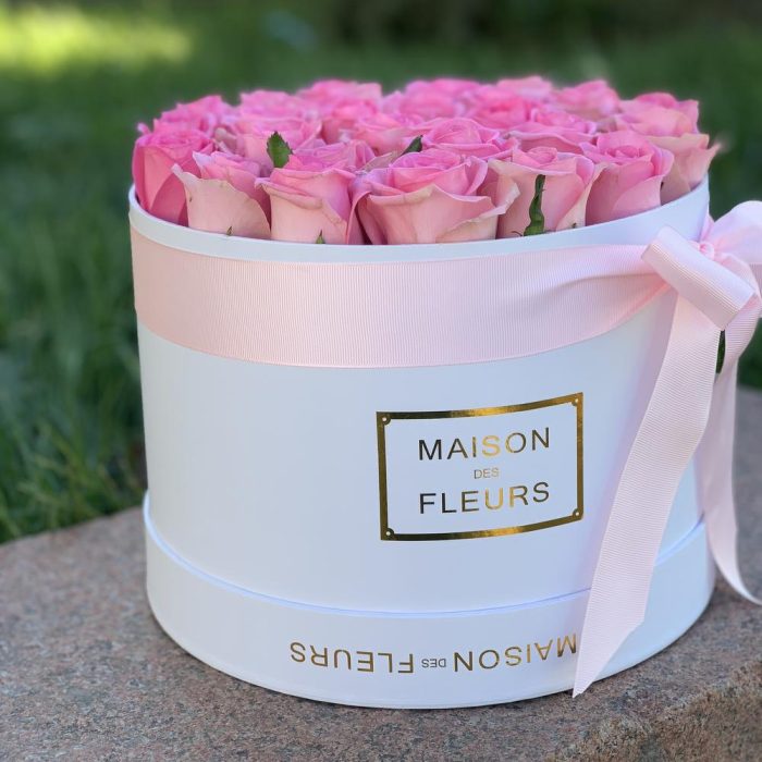 25 розовых роз в белой коробке
