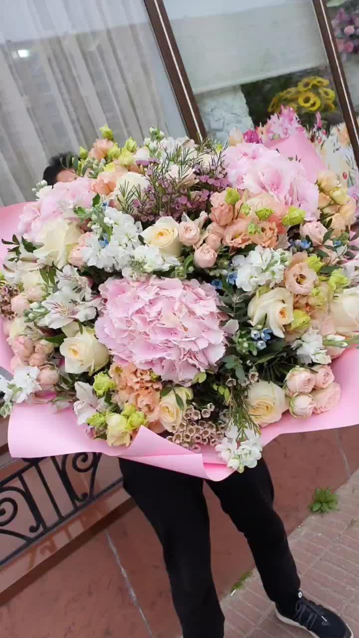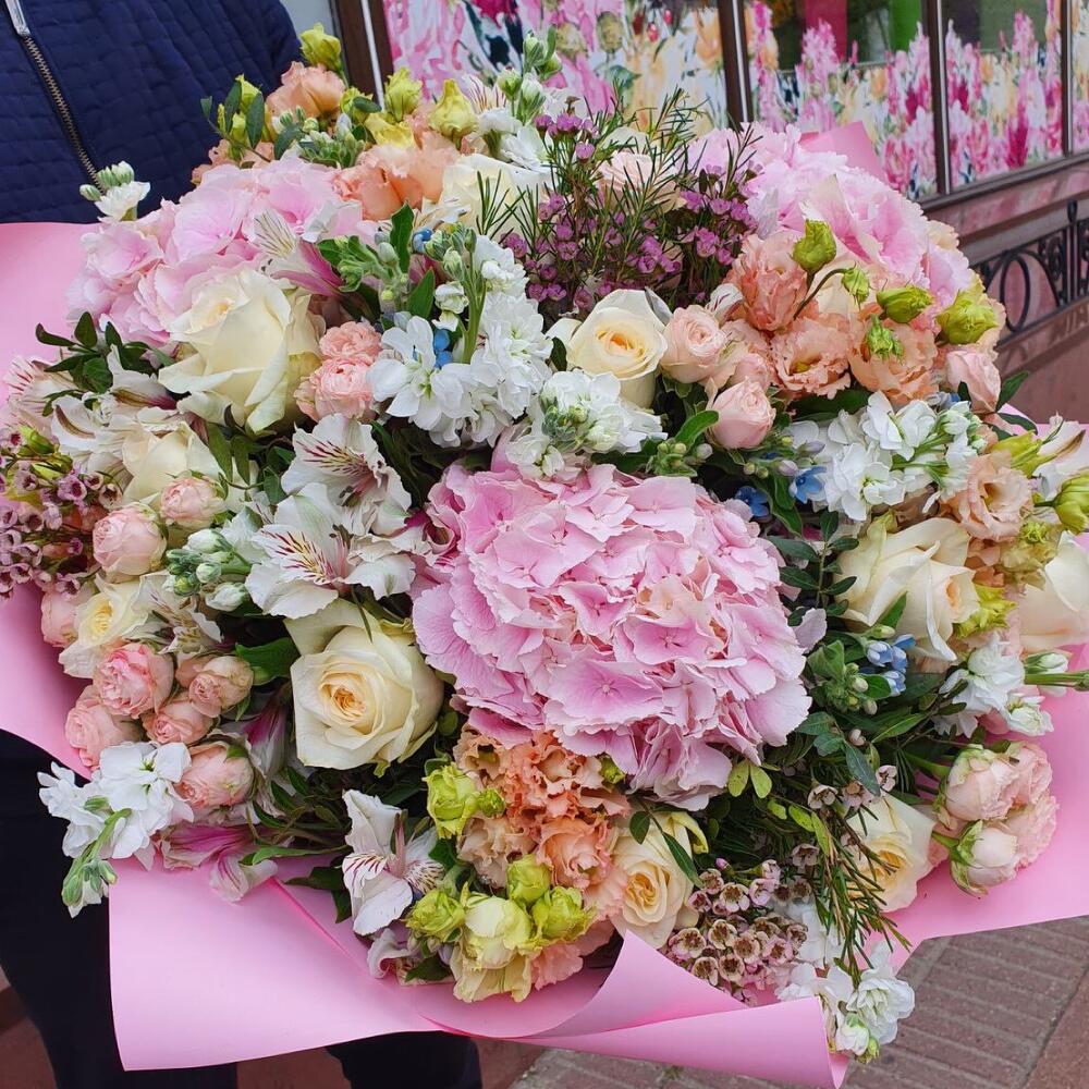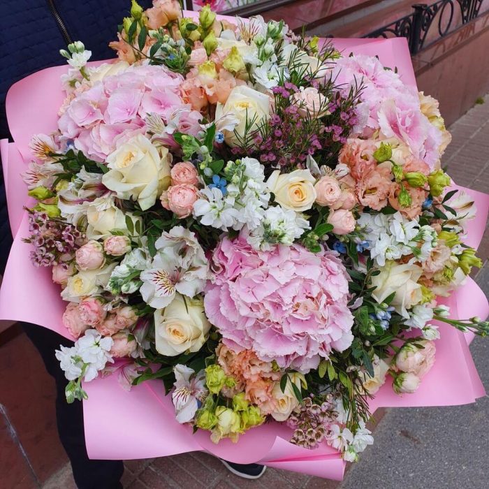 Гортензия розовая – 3 шт.Альстромерия – 10 шт.Маттиола – 10 шт.Лизиантус – 10 шт.Кустовая роза – 10 шт.Твидия – 12 шт.Роза Эквадор – 15 шт.Фисташка – 10 шт.Упаковка дизайнерская – 2 шт.Ваксфлауэр – 5 шт.