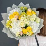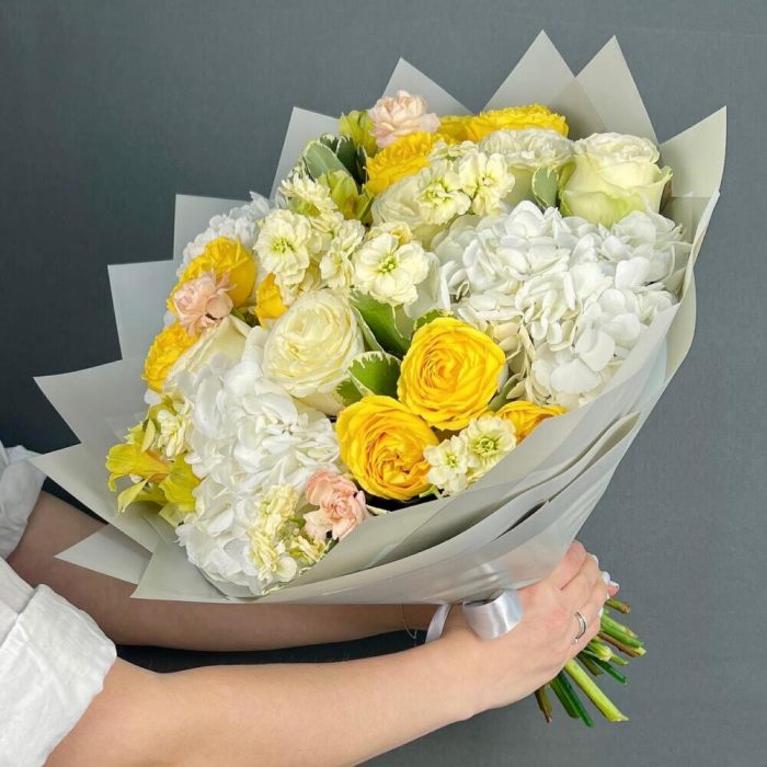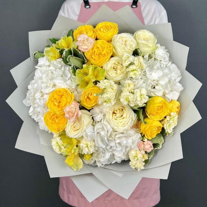 Авторский букет из белой Гортензии и желтых пионовидных Роз