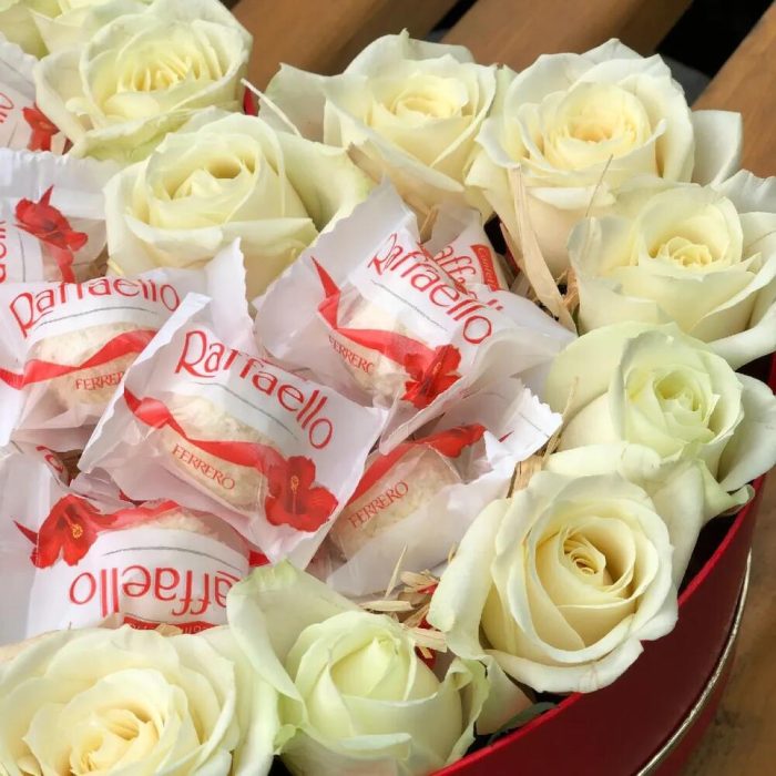 Роза белая – 19 шт. конфеты раффаэлло – 15 шт. Коробка в виде сердца – 1 шт.