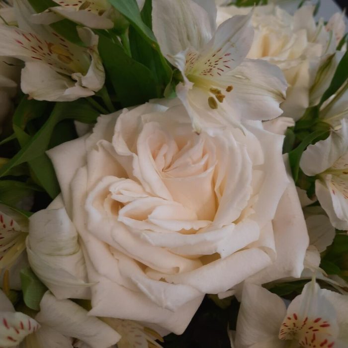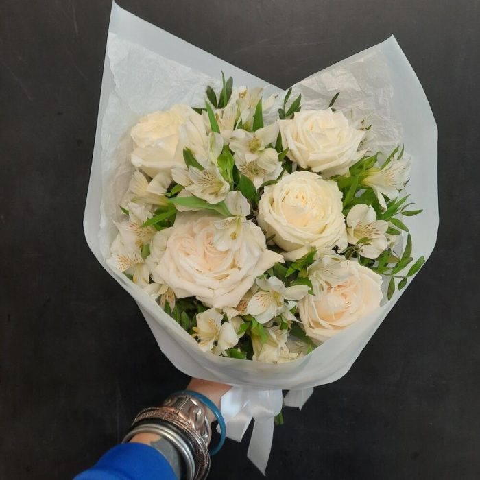 Роза белая – 5 шт. Альстромерия – 5 шт. Упаковка дизайнерская – 2 шт. Открыточка с вашими пожеланиями – 1 шт.