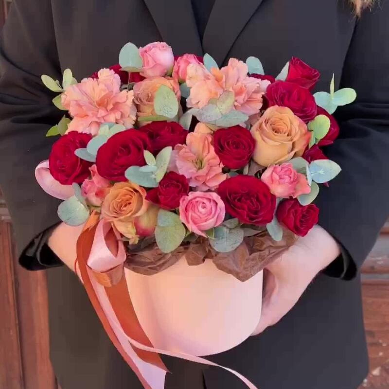 Роза Капучино – 3 шт.Эвкалипт – 3 шт.Лента атласная – 2 шт.Диантус – 3 шт.Коробка шляпная – 1 шт.Оазис флористический – 1 шт.роза кустовая мадам бомбастик – 1 шт.роза кустовая пионовидная ред трендсеттер – 2 шт.