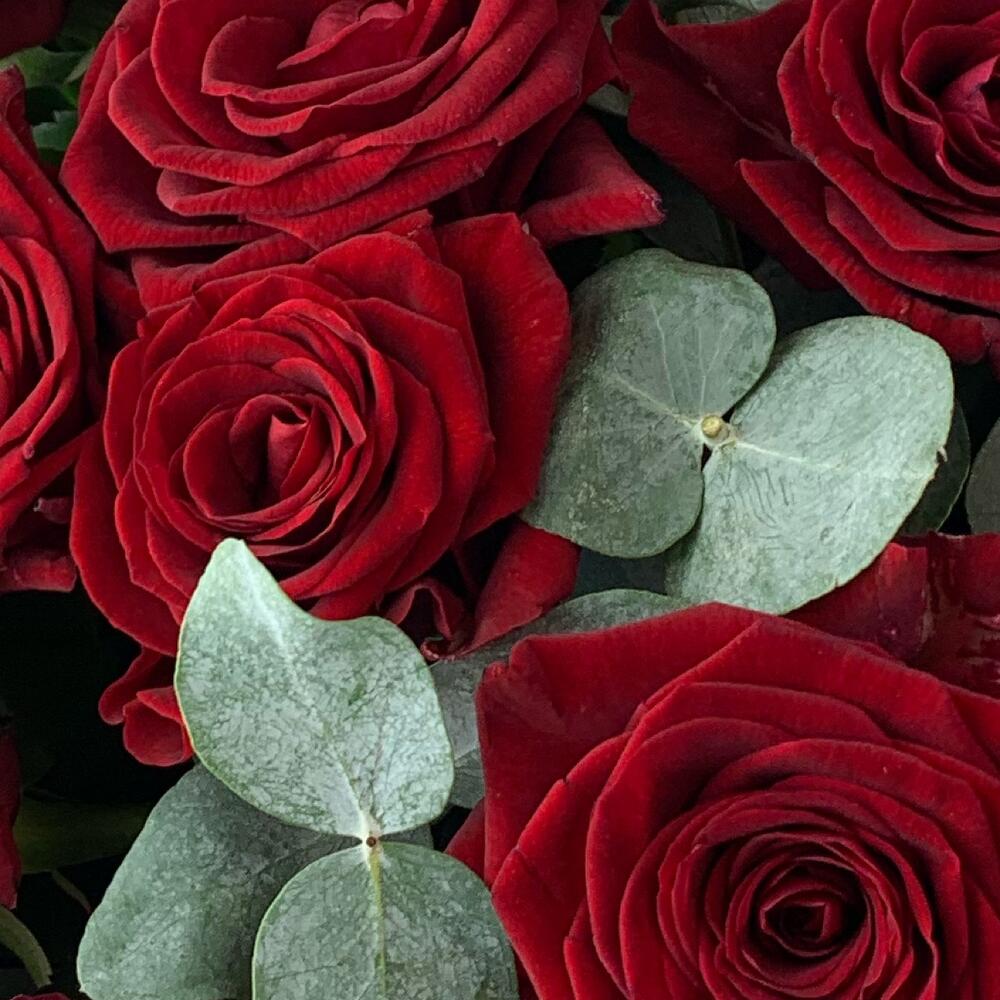 Лента – 1 шт.Эвкалипт – 4 шт.Роза красная 50 см – 15 шт.Матовая пленка – 1 шт.любовь флориста (бесплатно) – 1 шт.