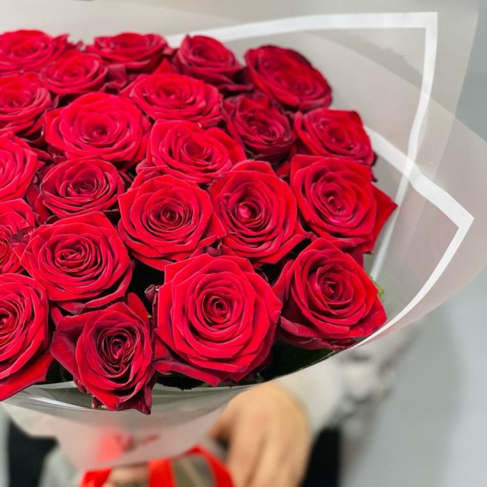 Лента атласная – 1 шт.Красная роза – 29 шт.Упаковка дизайнерская – 3 шт.
