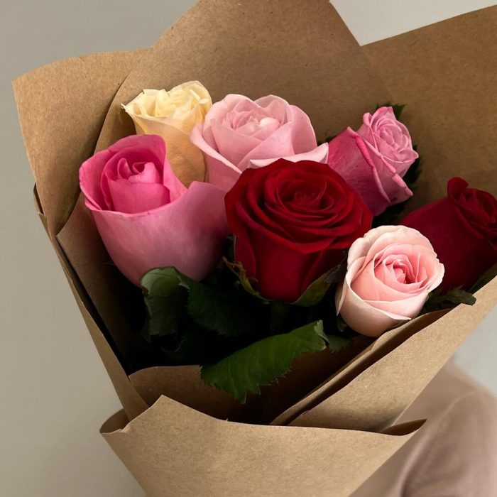 Роза – 7 шт.Лента атласная – 1 шт.Упаковка дизайнерская – 1 шт.