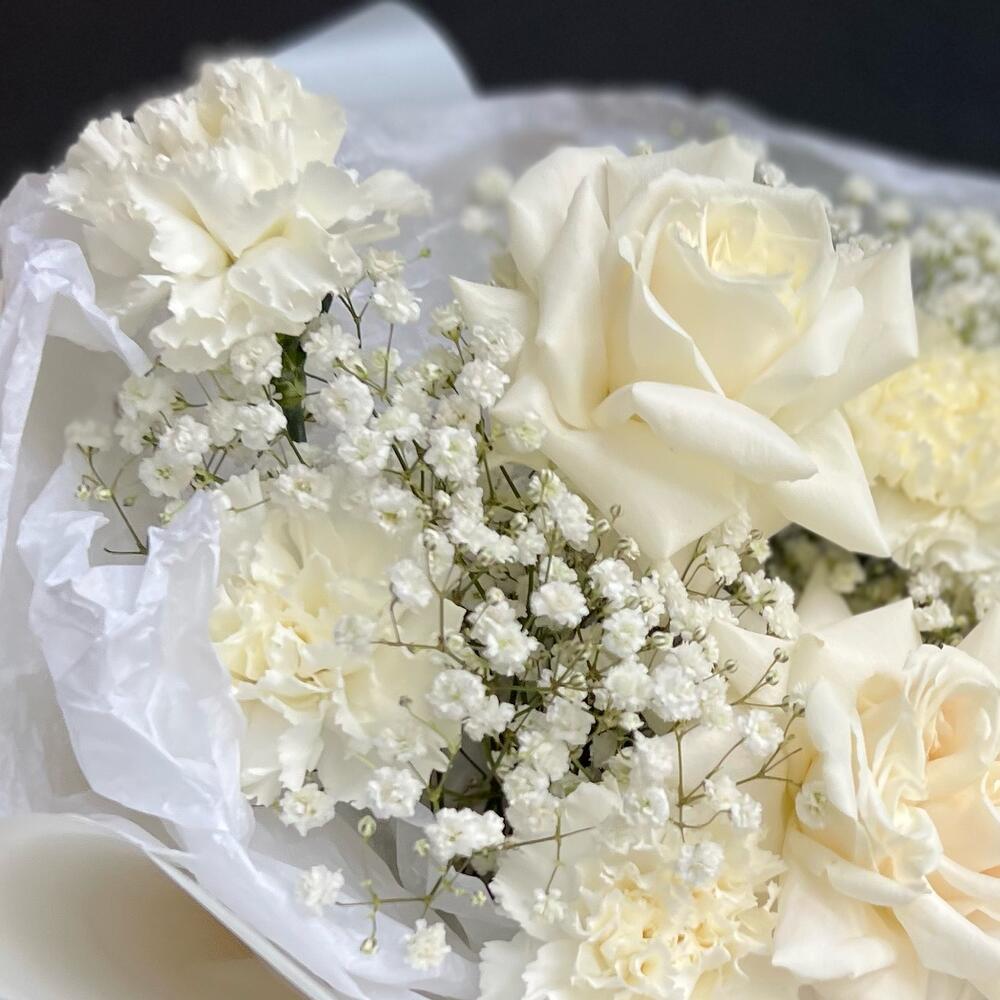 Роза – 3 шт.диантусы – 5 шт.Гипсофила – 4 шт.декоративная упаковка – 1 шт.Атласная лента – 1 шт.