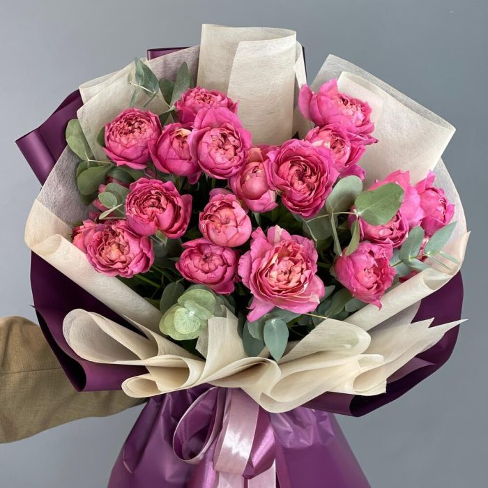 Лента – 2 шт.Эвкалипт – 2 шт.Упаковка – 2 шт.Роза Джульетта – 5 шт.