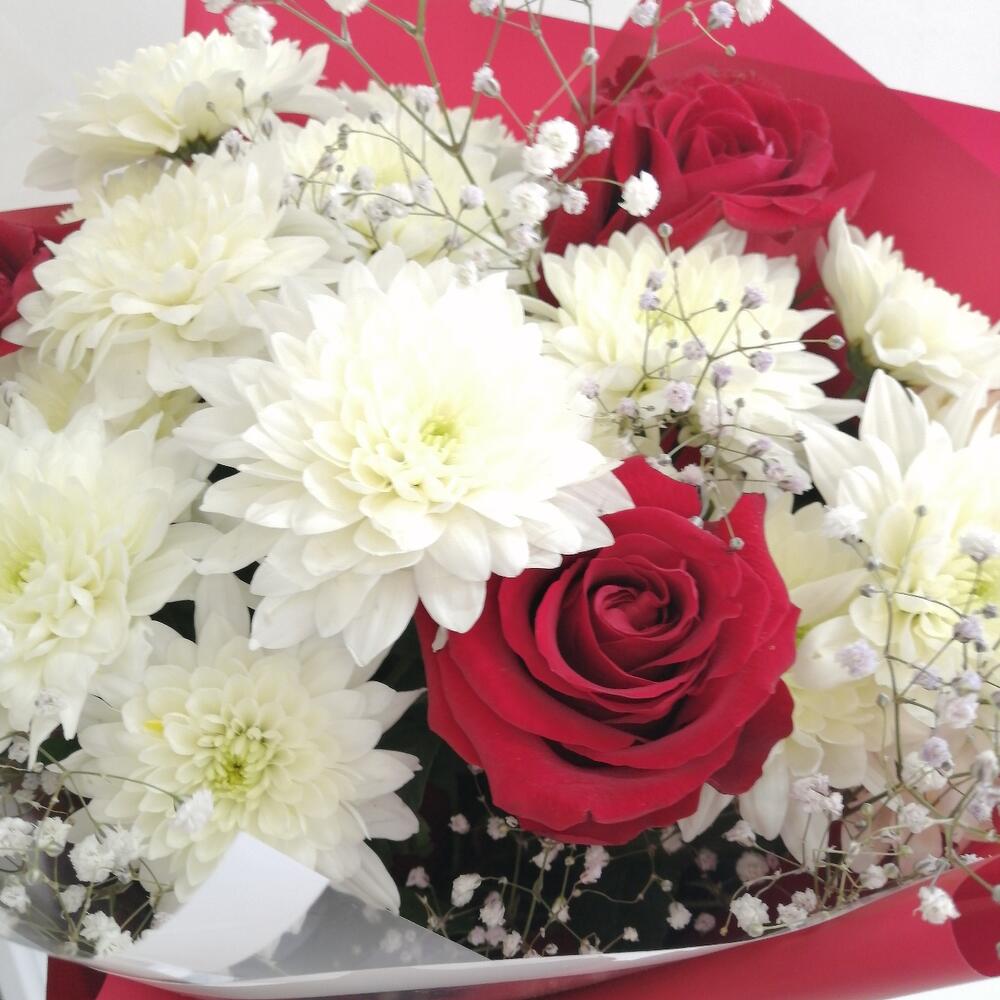 Гипсофила – 1 шт.Хризантема кустовая – 3 шт.Роза – 3 шт.Упаковка – 1 шт.