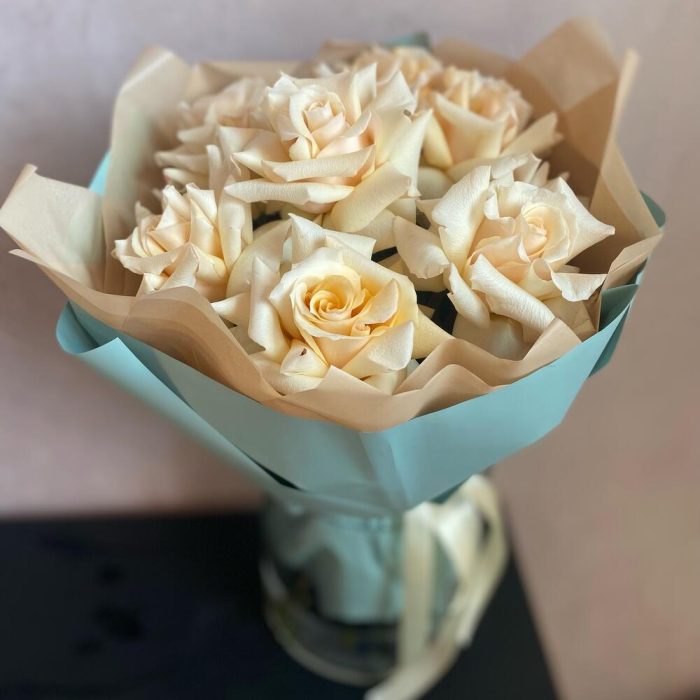 Роза – 7 шт.Дизайнерская упаковка – 1 шт.Тишью – 1 шт.Атласная лента – 1 шт.