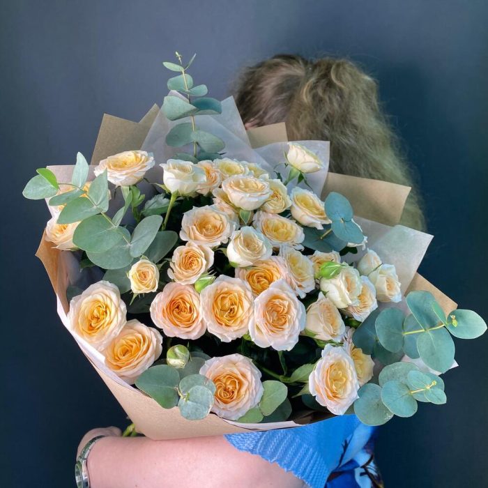 Роза кустовая – 5 шт.Крафт дизайнерский – 4 шт.Эвкалипт ценария – 2 шт.