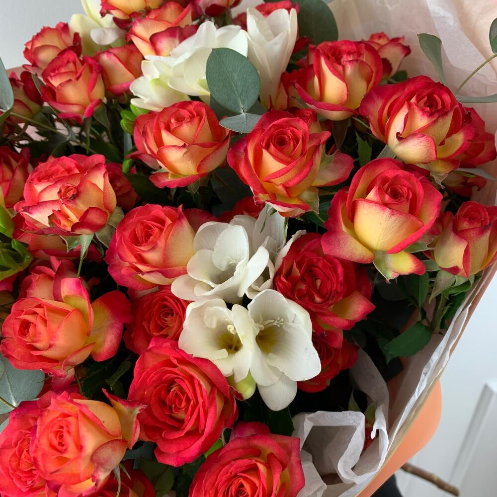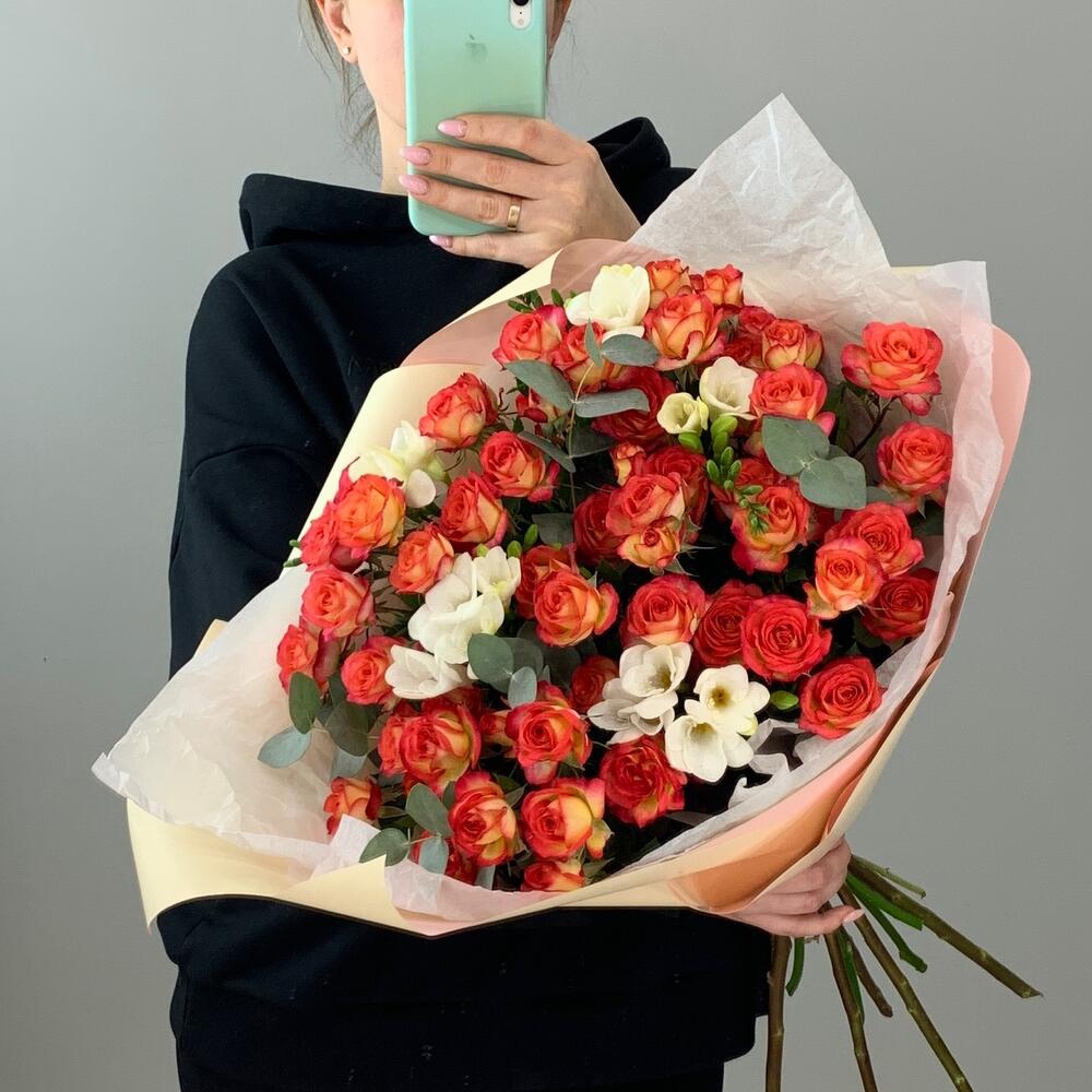 Букет «Плямя чувств» с кустовыми розами и фрезиями