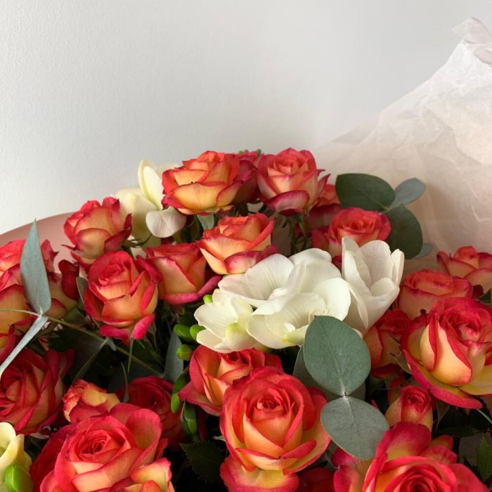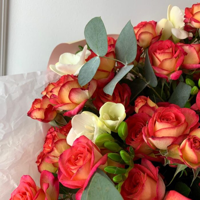 Роза кустовая 50 см – 5 шт.Фрезия белая – 5 шт.Эвкалипт – 3 шт.Тишью – 1 шт.Пленка дизайнерская – 1 шт.Лента атласная – 1 шт.