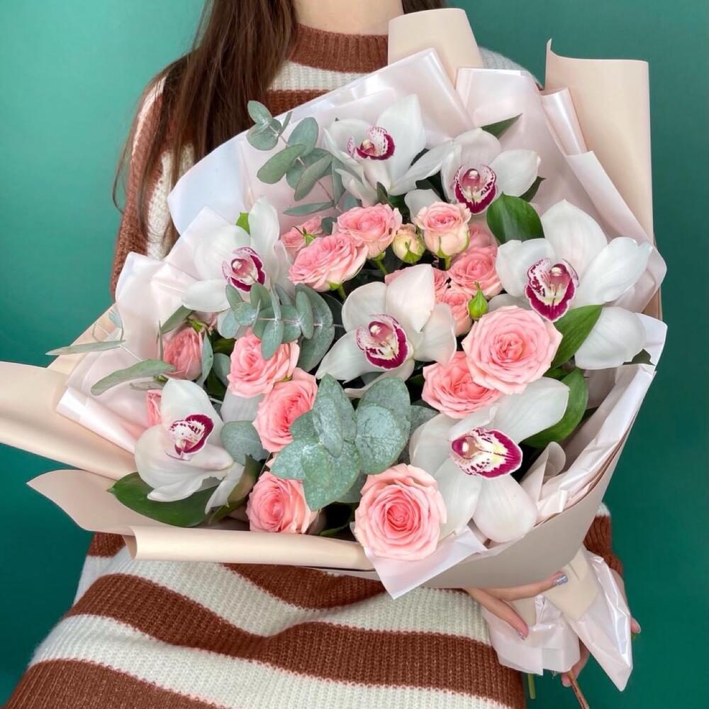 ЦИМБИДИУМ – 7 шт.Роза кустовая – 4 шт.Эвкалипт – 3 шт.Корейская упаковка – 2 шт.бант атласный – 1 шт.