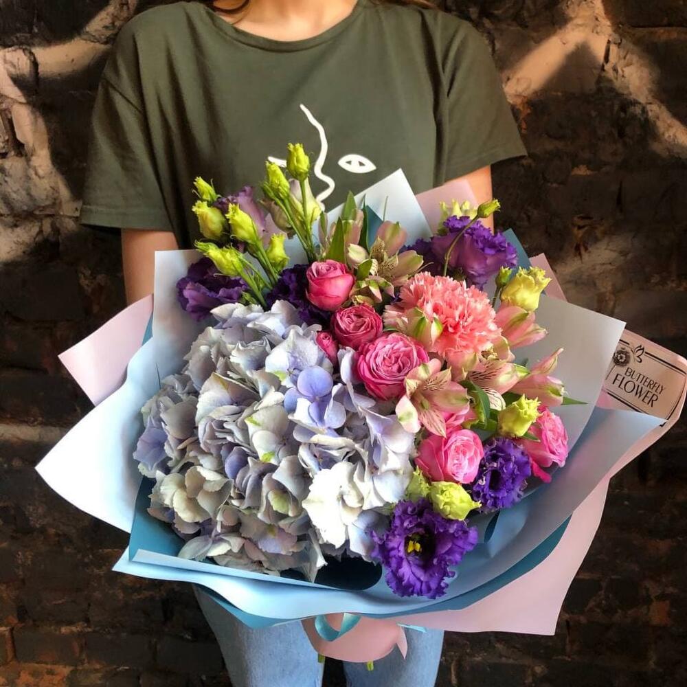 Букет с гортензией, кустовой розой и эустомой “Летнее волшебство”