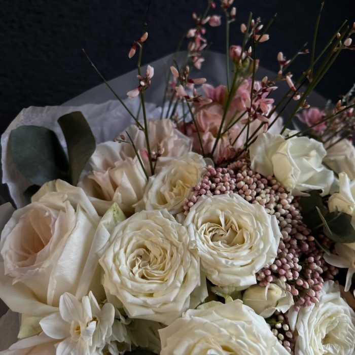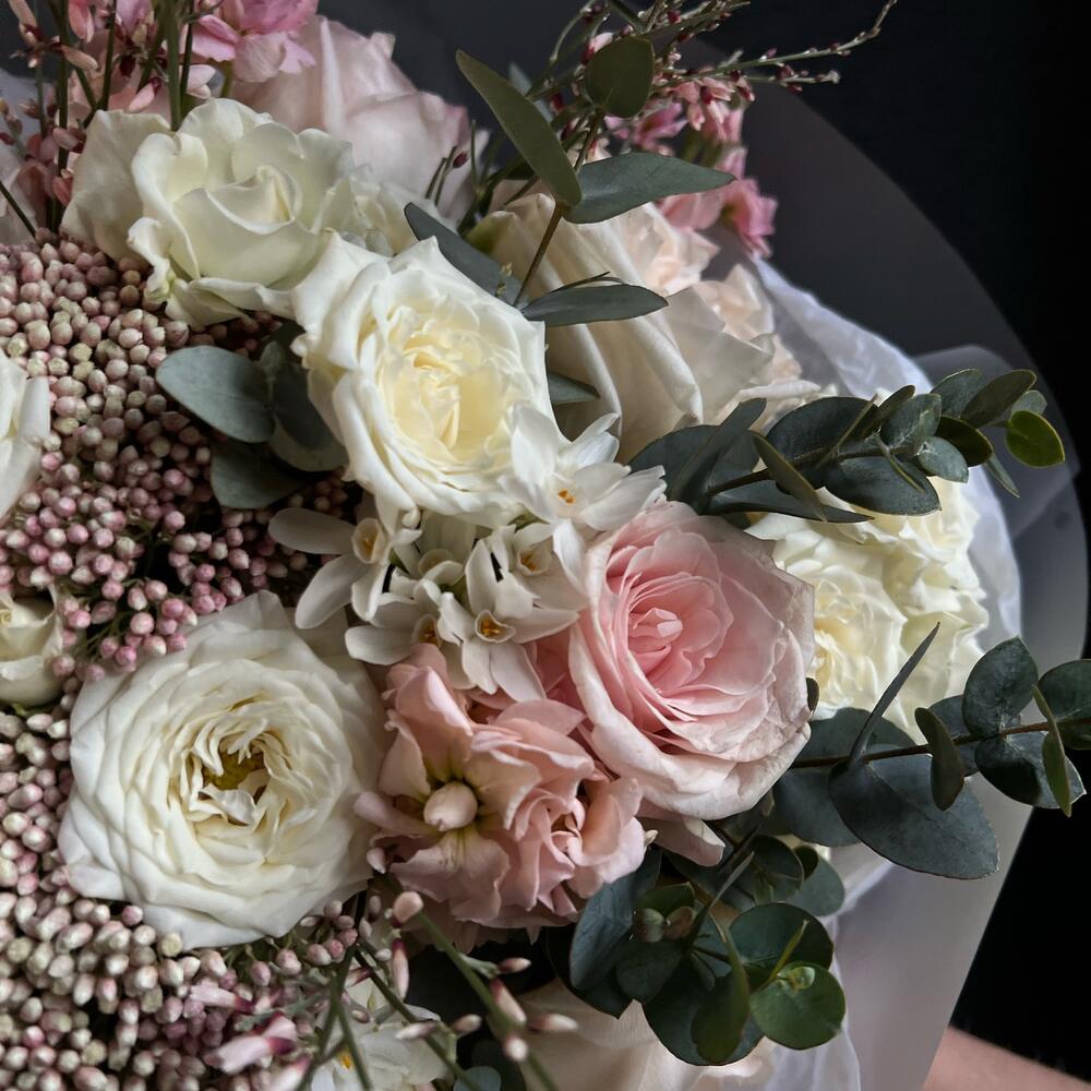Пионовидная роза – 9 шт.Кустовая роза – 5 шт.Одноголовая роза – 3 шт.Гениста – 2 шт.Озотамнус – 2 шт.Маттиола – 3 шт.нарциссов – 5 шт.Эвкалипт – 5 шт.декоративная упаковка – 1 шт.Атласная лента – 1 шт.
