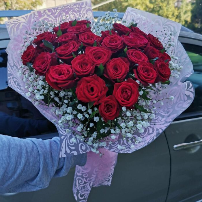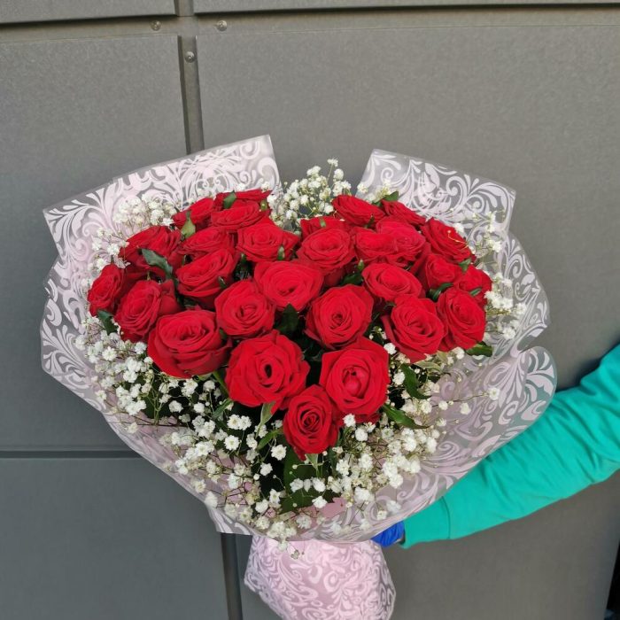 Красивый высокий букет из 31 красной крупной розы, собрано флористом в форме красивого сердца.