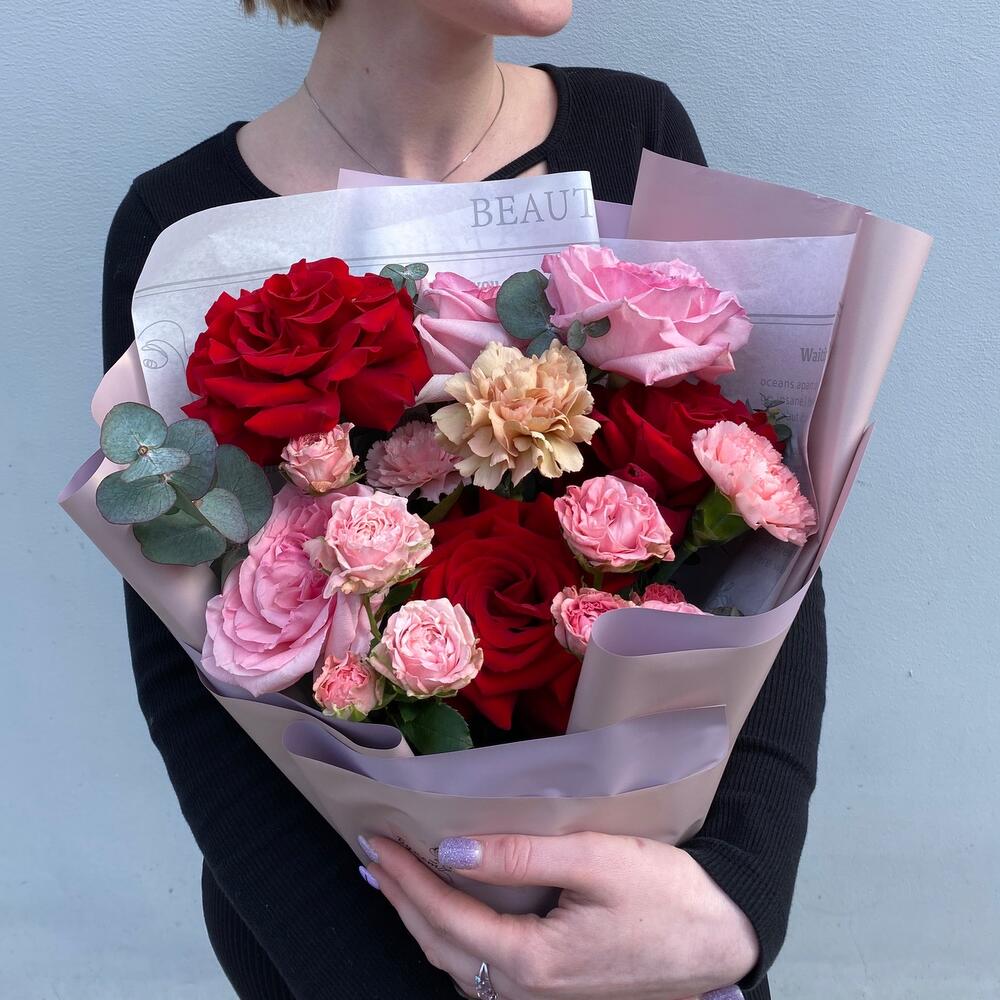 Букет «Влюбленность» (Премиальная роза O Hara, роза кустовая, роза красная, диантусы и эвкалипт)