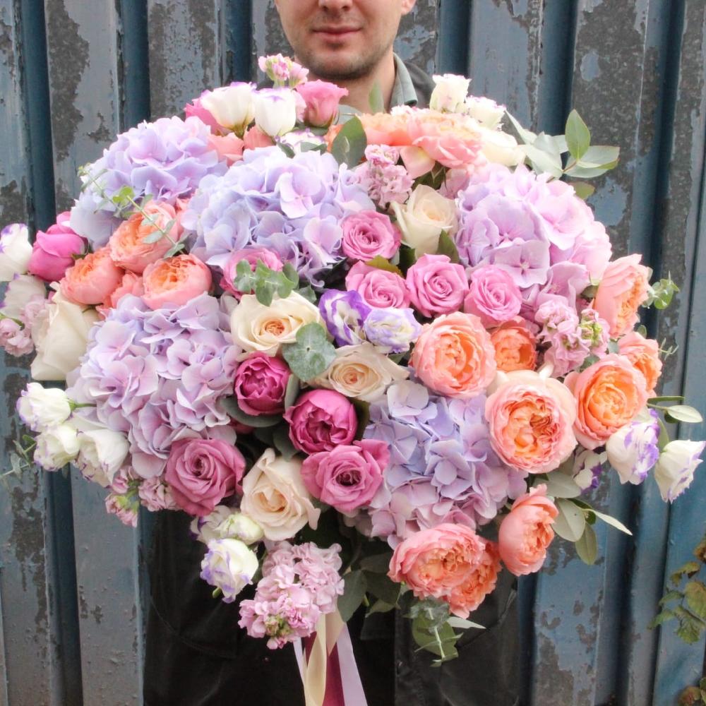 Роскошный букет из пионовидных роз, гортензий, маттиолы, лизиантуса и эвкалипта.Стильное цветочное решение длялюбого случая.Ширина букета около 80 сантиметров, высота букета около 60 сантиметров.