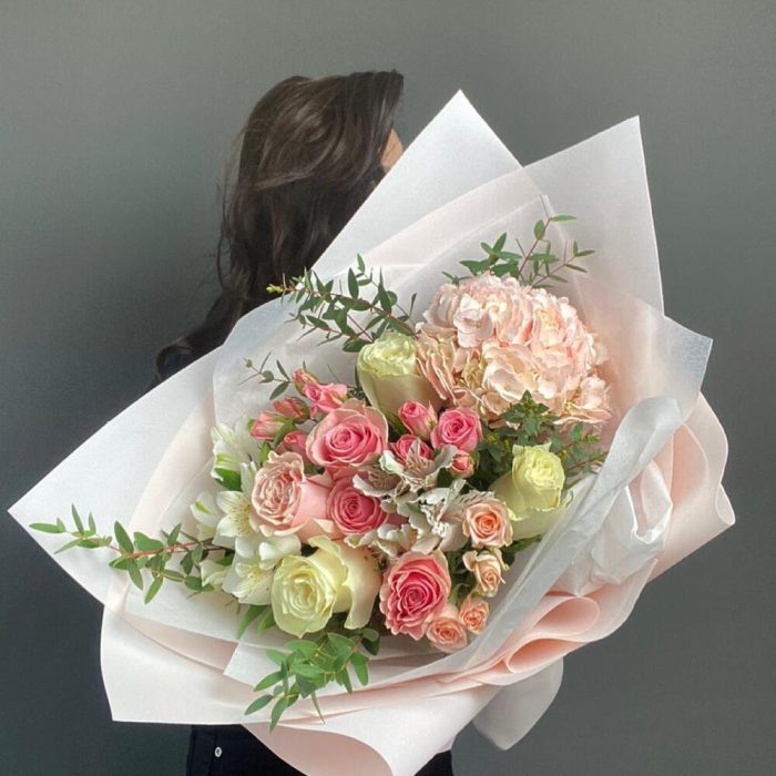 Авторский букет с ароматными розами и гортензией «Тайное влечение»