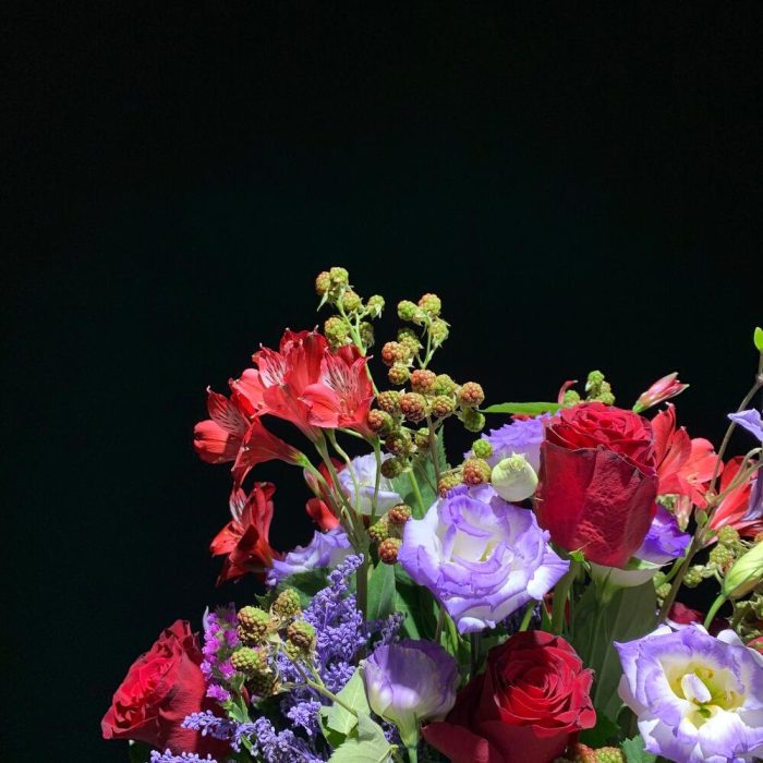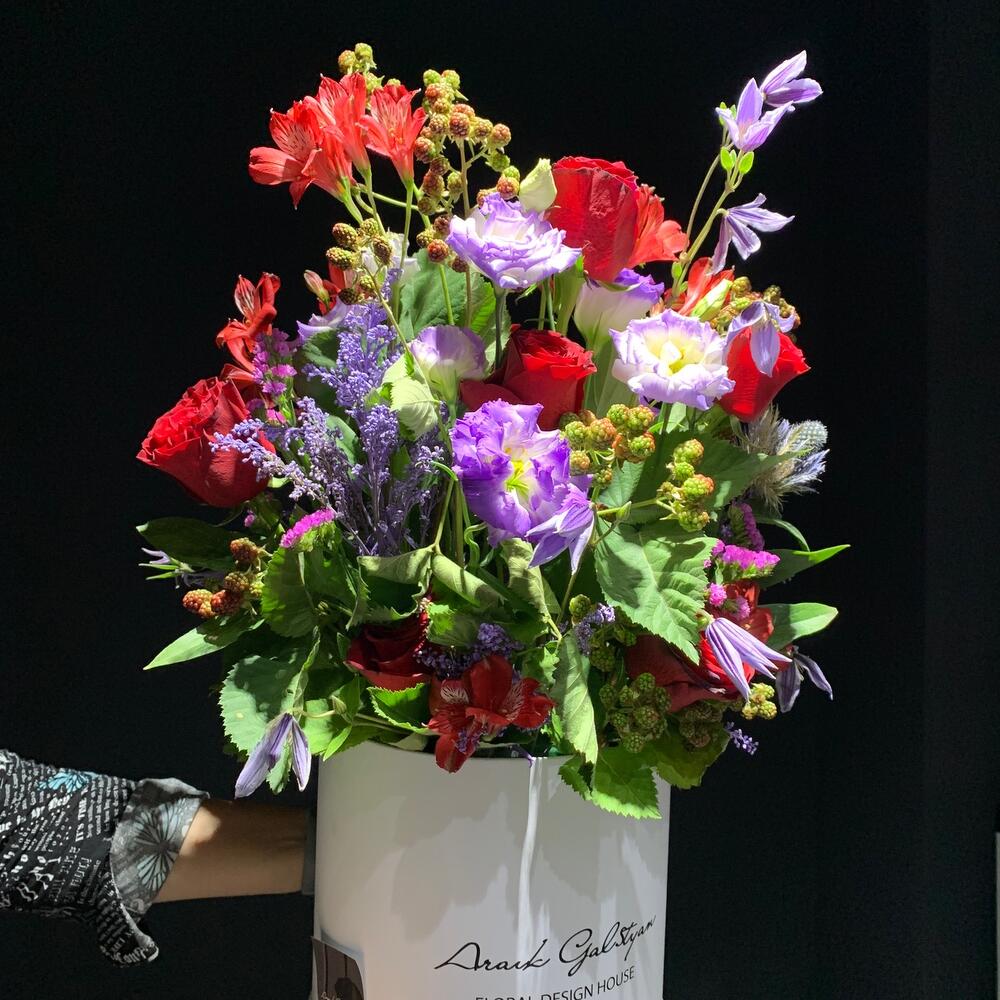 Альстромерия – 3 шт. Статица – 3 шт. Роза – 5 шт. Эустома – 8 шт. Клематис – 5 шт. ветки декоративные – 10 шт.
