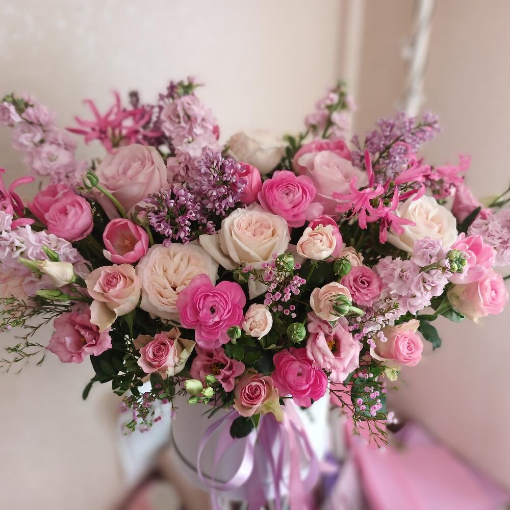 Цветы в коробке с пион розами,сиренью,ранункулюсами,эустомой,тюльпанами,матиолой,пионовидными кустовыми розами