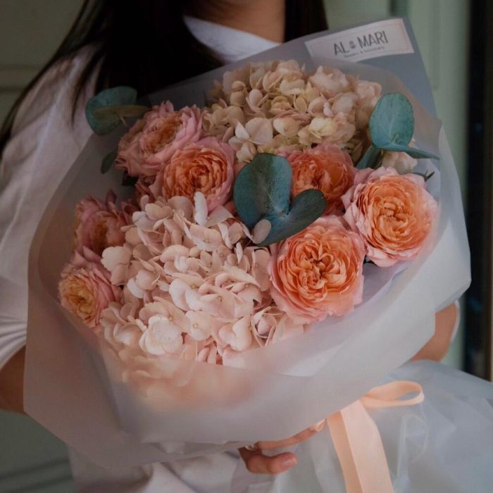 “Эвкалиптическая роскошь” гортензия и пионовидная кустовая роза