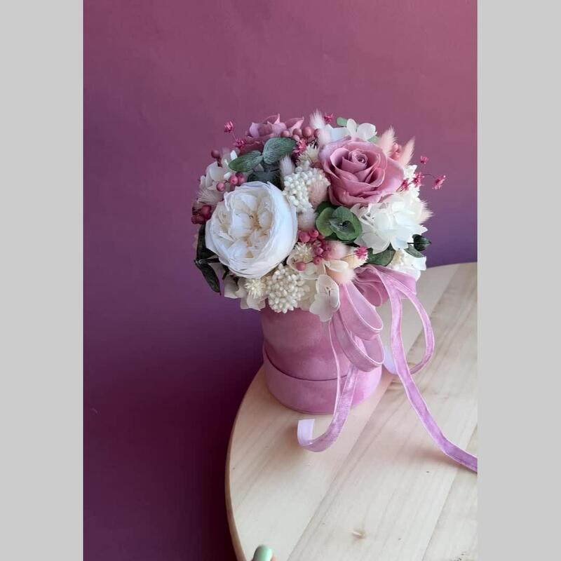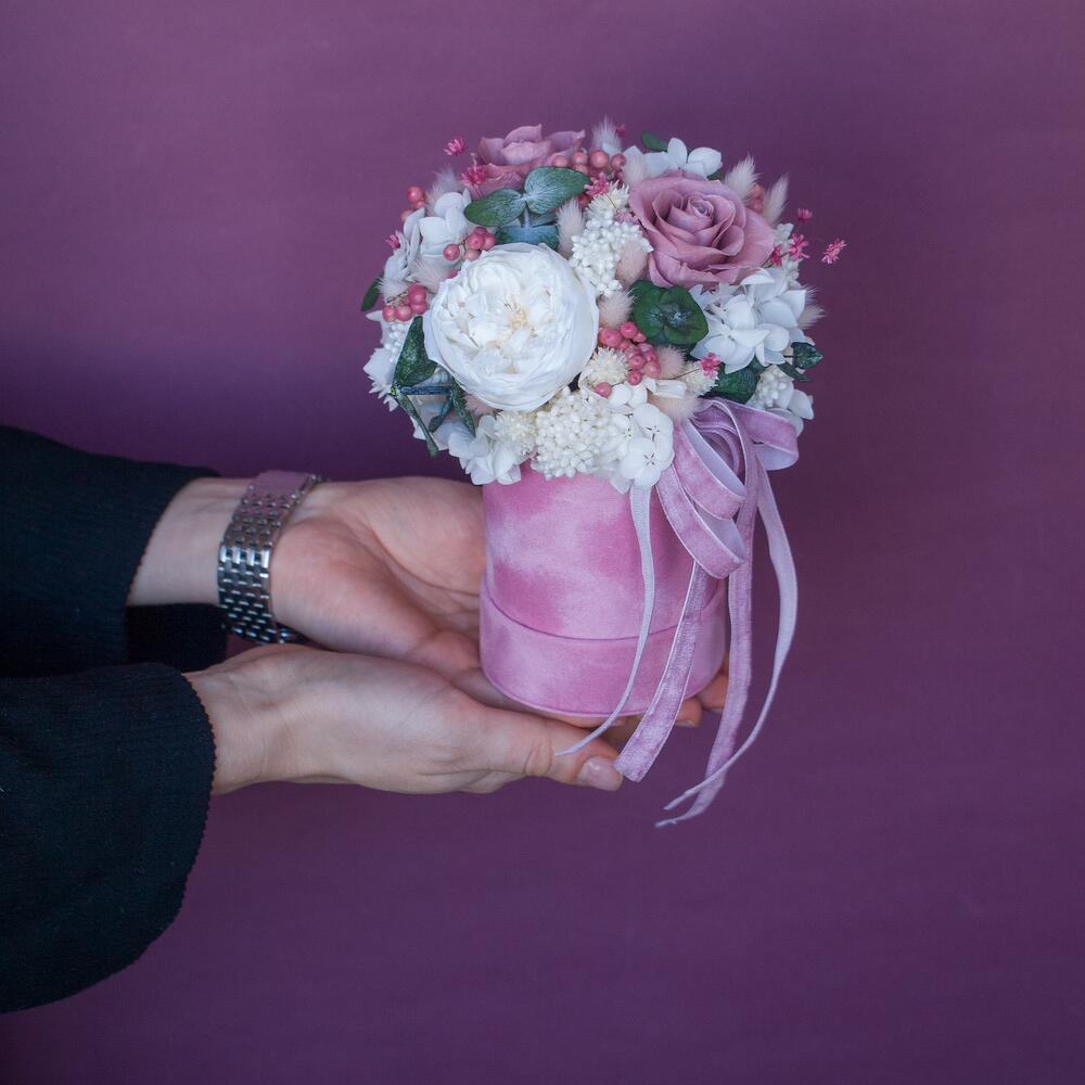 Композиция из сухоцветов и стабилизированных роз в мини шляпной коробке