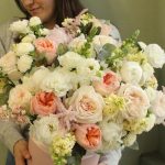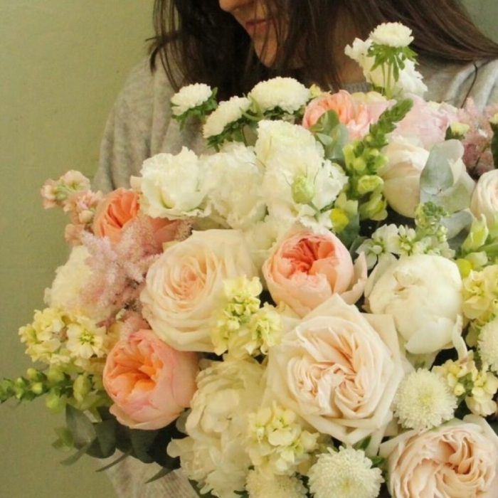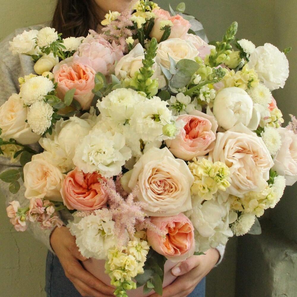 Роза английская пионовидная – 9 шт.Роза пионовидная – 11 шт.Пион – 9 шт.Маттиола – 11 шт.Львиный зев – 7 шт.Астра – 7 шт.Астильба – 5 шт.Лизиантус – 5 шт.Эвкалипт – 9 шт.Оазис флористический – 2 шт.Шляпная коробка – 1 шт.