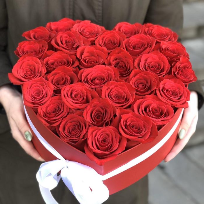 Роза красная – 29 шт. Коробка сердце – 1 шт. атласный бант – 1 шт. Оазис – 2 шт.