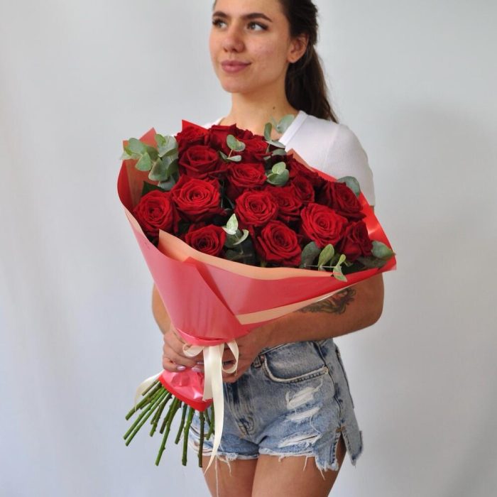 Красные розы с эвкалиптом, 19 штучек