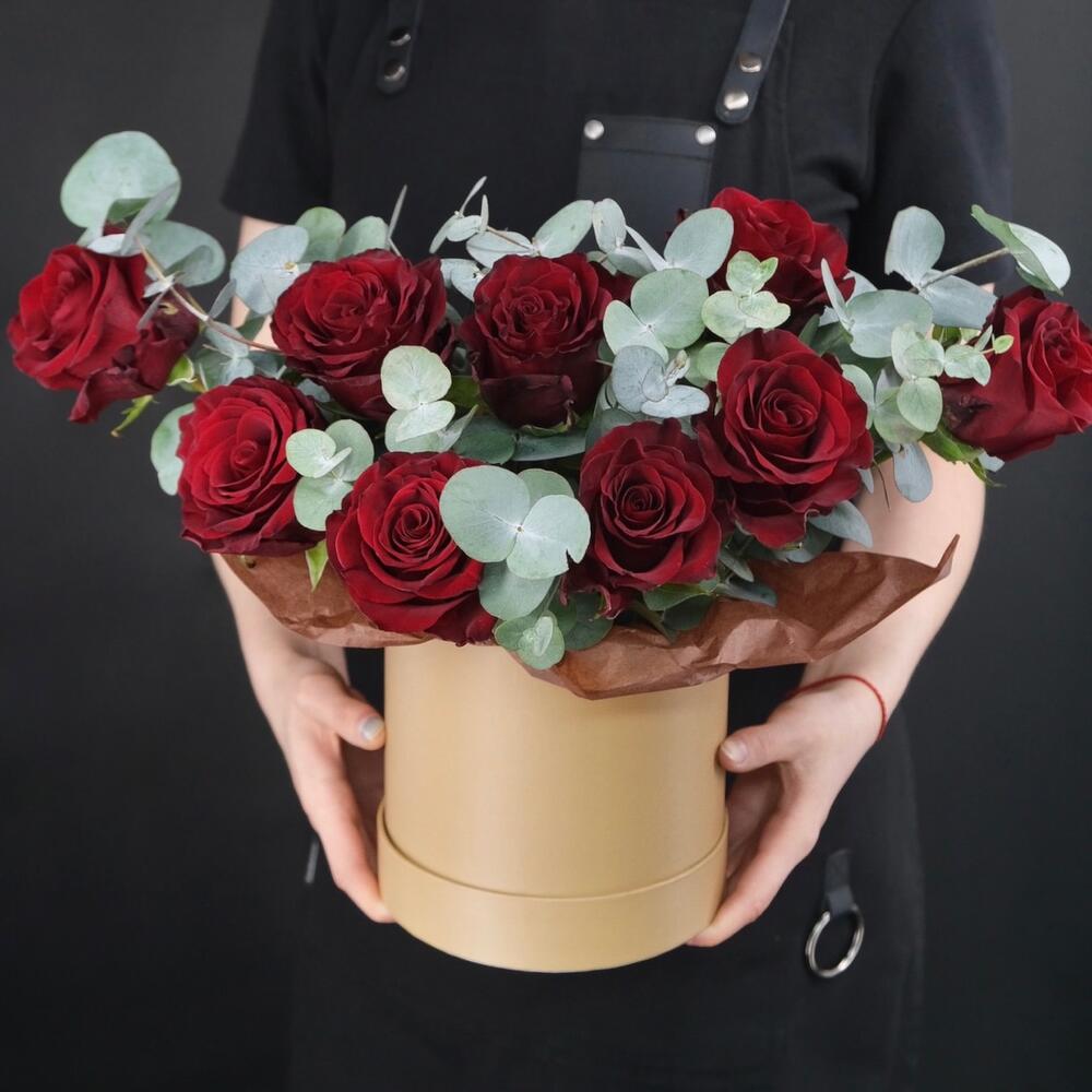 Эвкалипт – 2 шт.Роза – 9 шт.Инструкция по уходу – 1 шт.шляпная коробка с оазисом – 1 шт.подкормка для стойкости цветов – 1 шт.