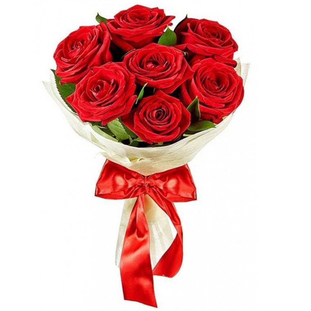 Роза красная – 7 шт.Рускус – 5 шт.Упаковка – 1 шт.Атласная лента – 1 шт.