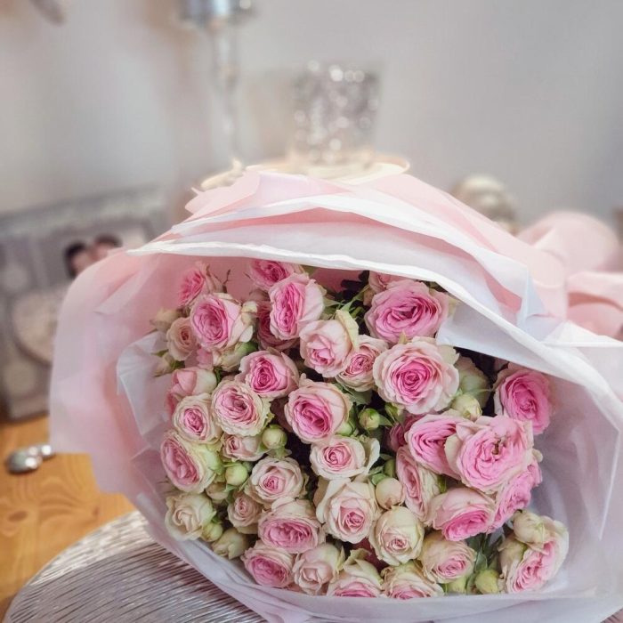 Лента атласная – 1 шт.Роза кустовая пионовидная – 7 шт.Пленка матовая – 1 шт.Открыточка с вашими пожеланиями – 1 шт.Тишью белое – 4 шт.любовь флориста (бесплатно) – 1 шт.