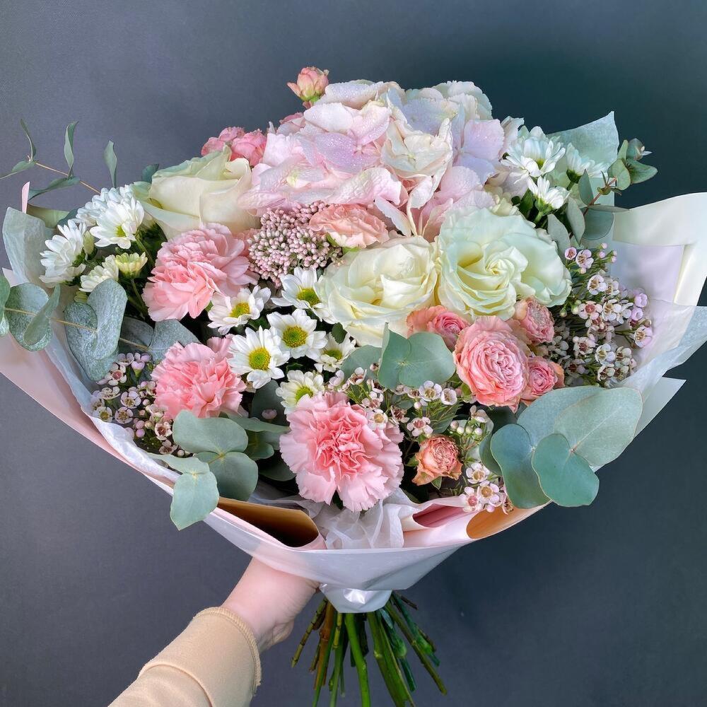 Гортензия розовая – 1 шт.Роза Эквадор – 3 шт.Сантини микс – 4 шт.Озотамнус – 1 шт.ваксфлауэр ветка – 2 шт.Диантус – 3 шт.Роза кустовая – 3 шт.эвкалипт ветка – 1 шт.Упаковка дизайнерская – 5 шт.